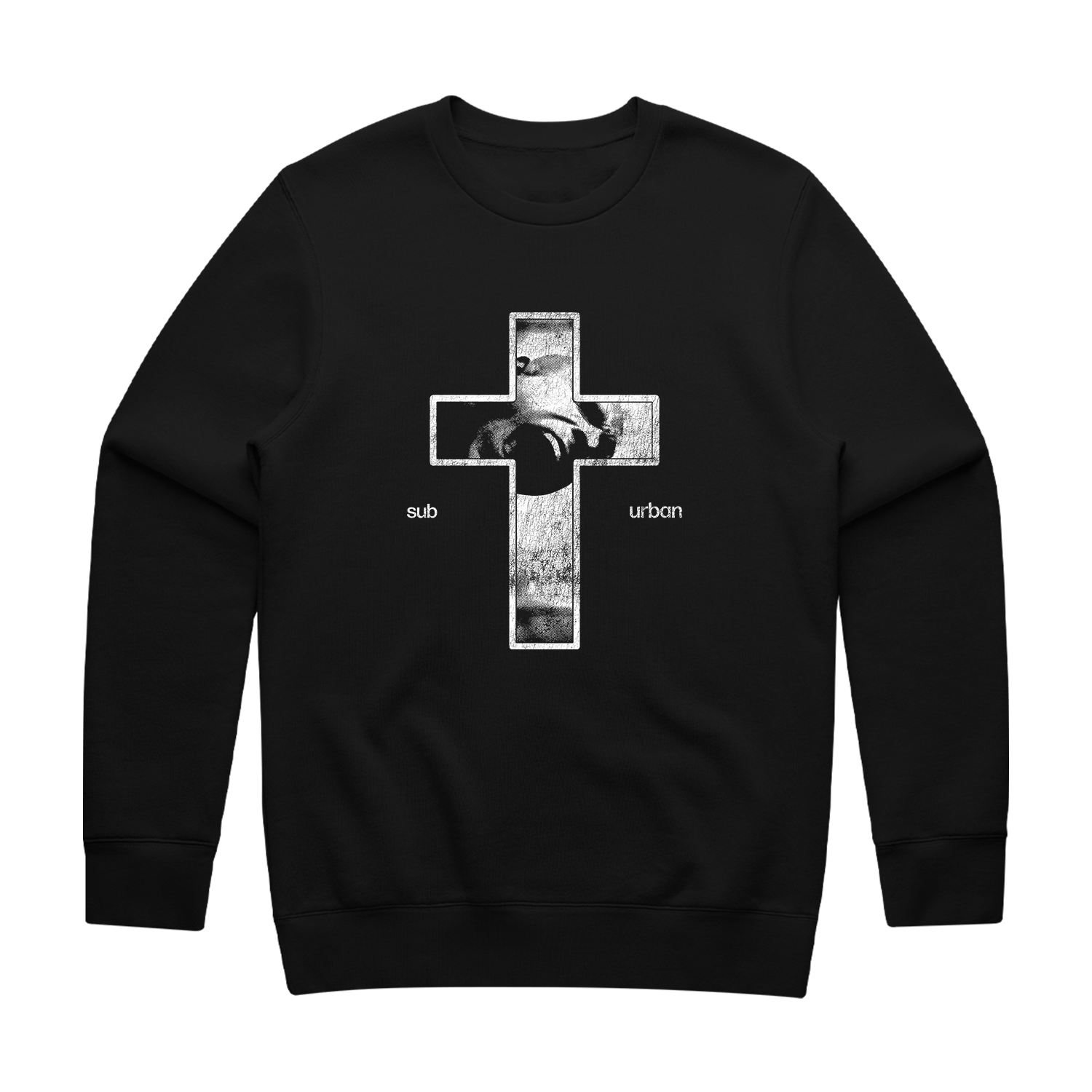 Screen printed on a black 80/20 cotton/recycled polyester CVC fleece crewneck